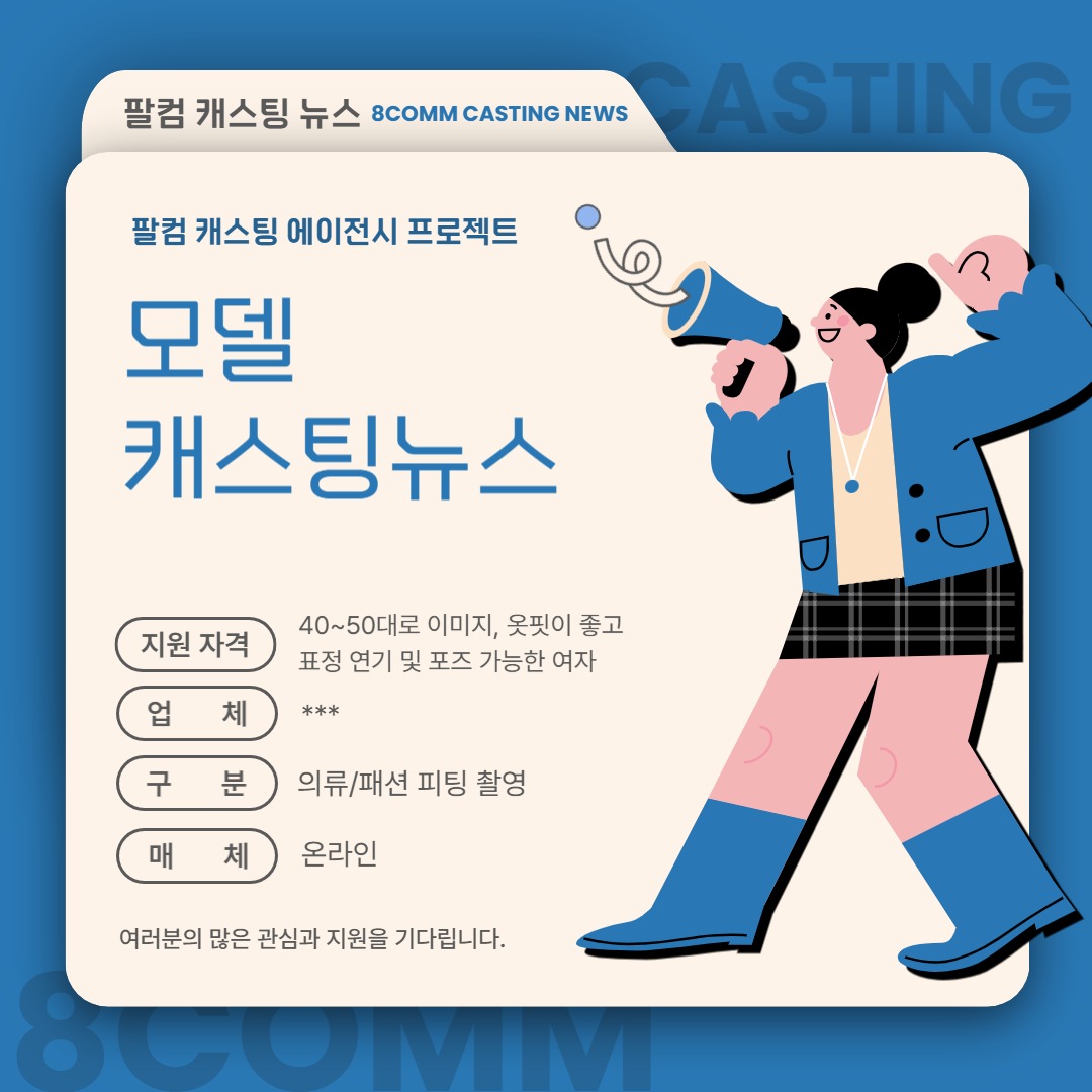 [캐스팅 뉴스] 의류/패션 피팅 촬영할 모델을 섭외합니다. 페이지 정보 조회 25 작성일 26-01-08 15:20 본문 -섭외대상:* 40~50대로 이미지, 옷핏이 좋고 표정 연기 및 포즈 가능한 여자 -업체: ***-구분: 의류/패션 피팅 촬영-매체: 온라인-촬영일정: 12월 중-촬영장소: 미정 목록