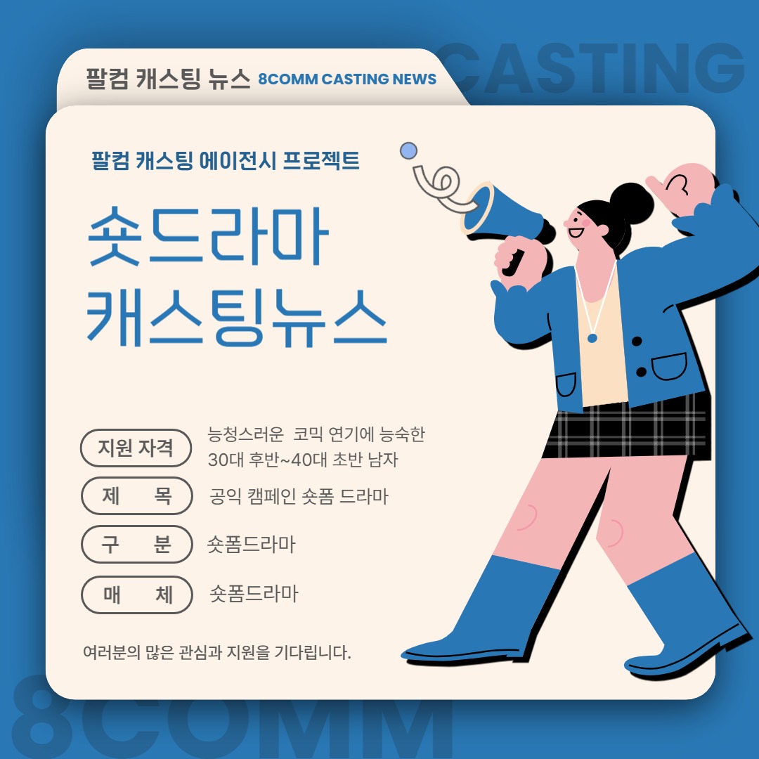 [캐스팅 뉴스] 공공기관 숏드라마에 출연할 배우를 섭외합니다. 페이지 정보 조회 19 작성일 26-01-08 15:23 본문 -섭외대상:* 능청스러운 코믹 연기에 능숙한 30대 후반~40대 초반 남자 -제목: 공익 캠페인 숏폼 드라마-구분: 숏폼드라마-매체: 숏폼드라마-촬영일정: 12월 중-촬영장소: 서울/경기 목록
