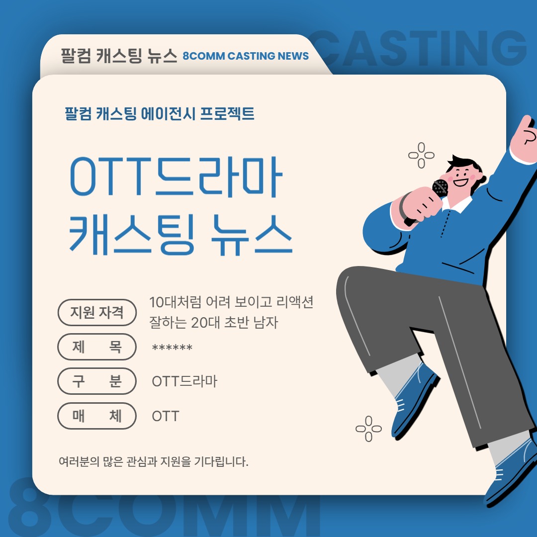 [캐스팅 뉴스] OTT 드라마 촬영에 참여할 배우를 모집합니다. 페이지 정보 조회 2 작성일 26-02-06 12:54 본문 -섭외대상:* 10대처럼 어려 보이고 리액션 잘하는 20대 초반 남자 -제목: ****-구분: OTT드라마-매체: OTT-촬영일정: 2026년 1월~-촬영장소: 미정 목록