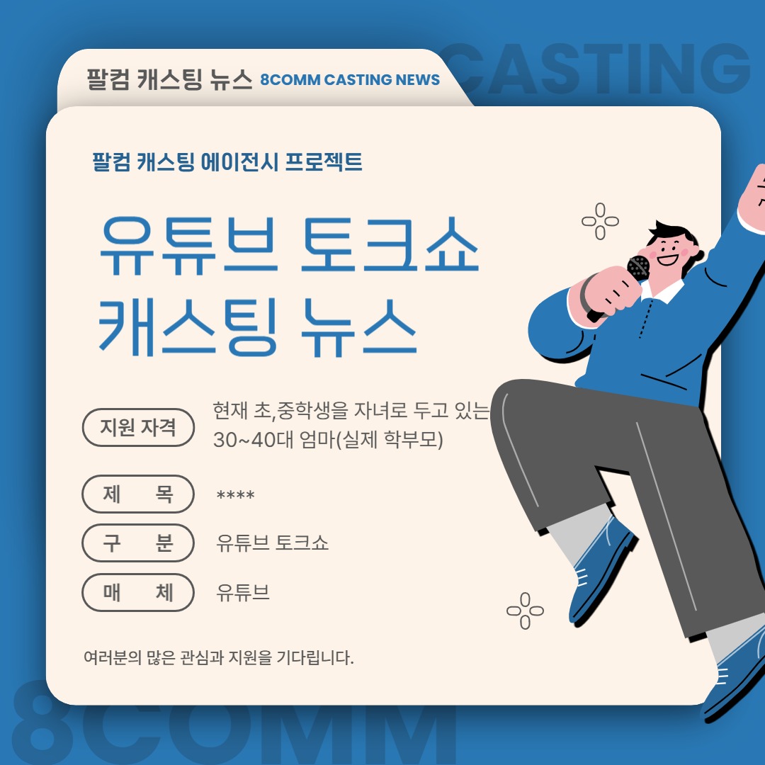 [캐스팅 뉴스] OO교육 유튜브 토크쇼에서 실제 학부모 배우를 모집합니다. 페이지 정보 조회 3 작성일 26-02-06 15:40 본문 * 현재 초,중학생을 자녀로 두고 있는 30~40대 엄마(실제 학부모) -제목: ****-구분: 유튜브 토크쇼-매체: 유튜브-촬영일정: 2026년 1월 말-촬영장소: 미정 목록