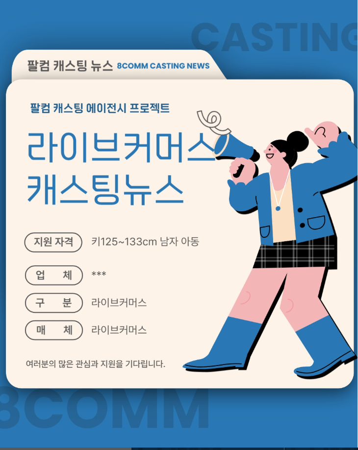 [캐스팅 진행] 라이브커머스_아동복 페이지 정보 조회 20 작성일 25-10-31 16:28 본문 [캐스팅 뉴스]아동복 라이브커머스 촬영에 참여 할 아동 섭외.-업체: 쇼핑 라이브-제품군: 아동복-일정: 미정-장소: 미정-조건:* 키 125~133cm / 옷사이즈 130사이즈로 이미지와 옷핏이 좋은 남자8comm1140@naver.com이메일로 프로필지원 부탁드립니다. 목록