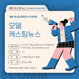 [캐스팅뉴스]키즈 수영복/레쉬가드 피팅 촬영할 아동 모델을 섭외합니다. 페이지 정보 조회 19 작성일 26-01-08 13:36 본문 -섭외대상:* 키 165~145cm 몸무게 30~50kg으로 이미지 좋고 포즈 잘 취하는 남,여 -업체: ***-구분: 수영복/레쉬가드 촬영-매체: 온라인, 룩북-촬영일정: 26년 1월 중-촬영장소: 미정 목록