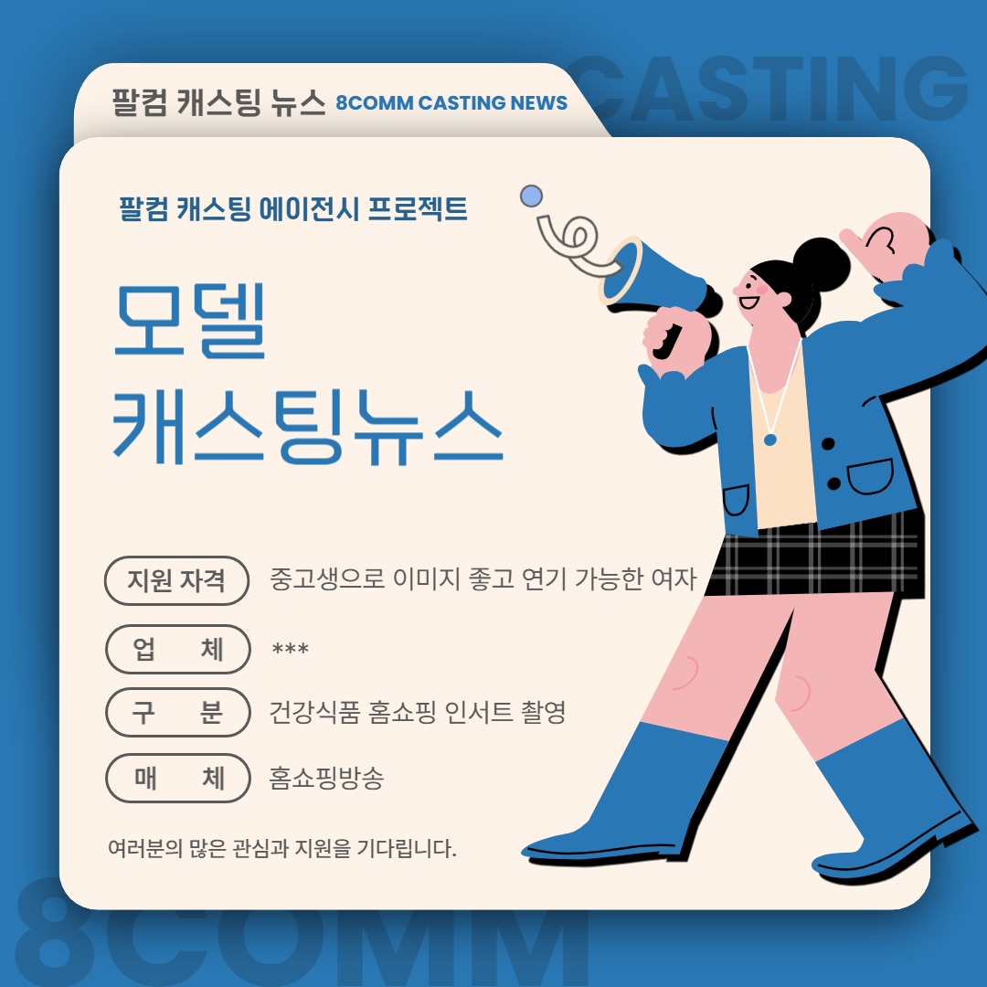 [캐스팅 뉴스] 건강식품 홈쇼핑 인서트 촬영할 청소년 모델을 섭외합니다. 페이지 정보 조회 3 작성일 26-02-07 17:25 본문 -섭외대상:* 중고생으로 이미지 좋고 연기 가능한 여자 -업체: ***-구분: 건강식품 홈쇼핑 인서트 촬영-매체: 홈쇼핑방송-촬영일정: 26년 1월 중-촬영장소: 미정 목록