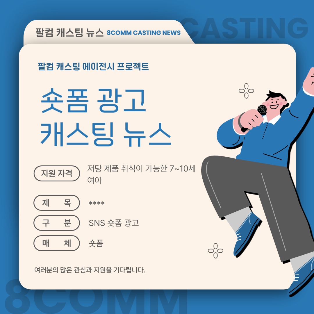 [캐스팅 뉴스] SNS 숏폼 광고 콘텐츠에 출연할 아역 배우를 섭외합니다. 페이지 정보 조회 2 작성일 26-02-11 12:14 본문 -섭외대상:* 저당 제품 취식이 가능한 7~10세 여아 -제목: ****-구분: SNS 숏폼 광고-매체: 숏폼-촬영일정: 2026년 1월 말-촬영장소: 서울 목록