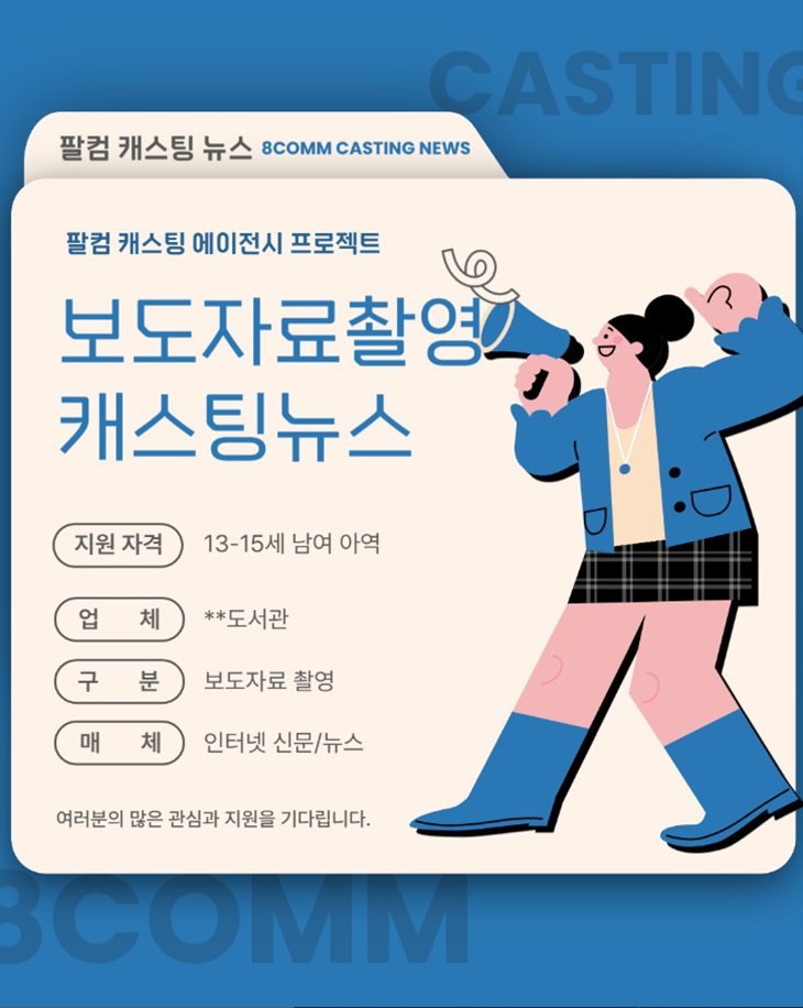 [캐스팅 진행] 보도자료촬영_인터넷 신문/뉴스 페이지 정보 조회 42 작성일 25-10-31 16:52 본문 [캐스팅 뉴스]경기도 청소년 도서관 보도자료 촬영에 참여 할 모델을 섭외합니다.* 섭외대상:- 13세~15세 표정연기 잘하는 남/여* 업체: **도서관* 구분: 보도자료 촬영* 매체: 인터넷 신문/뉴스- 촬영일정 : 미정- 촬영장소 : 미정8comm1140@naver.com이메일로 프로필지원 부탁드립니다. 목록